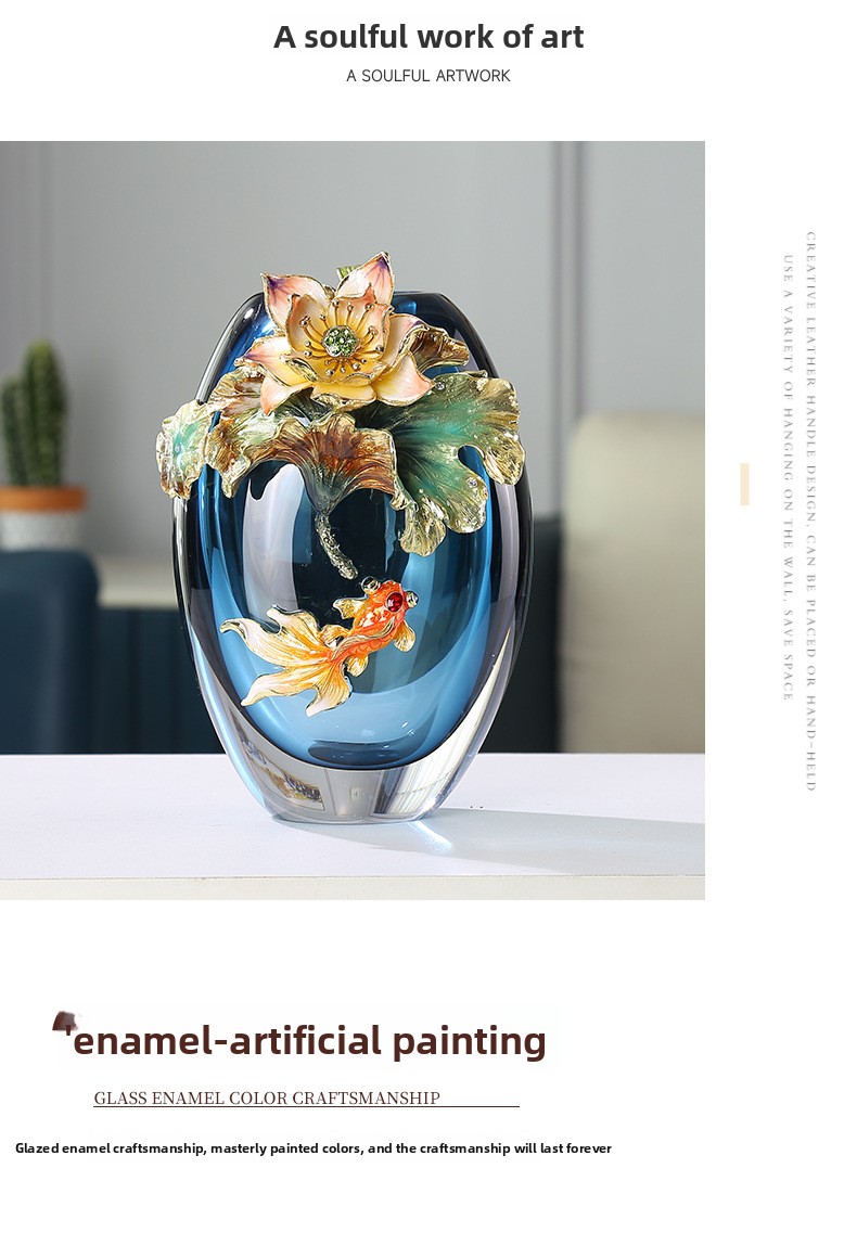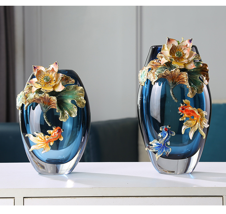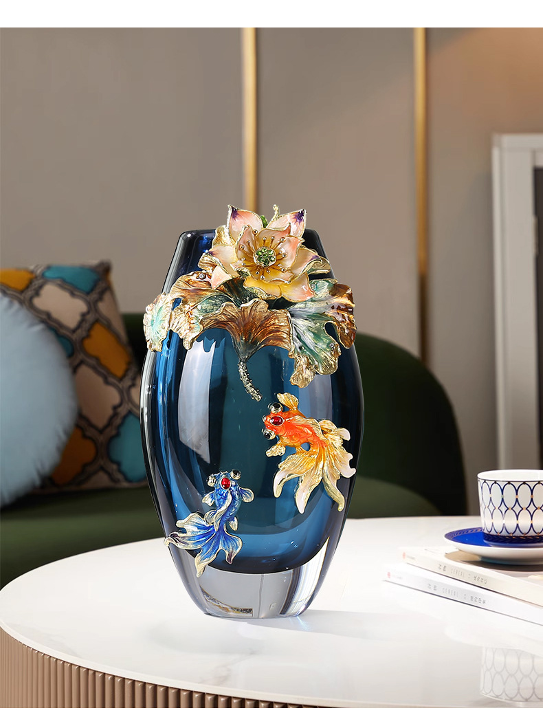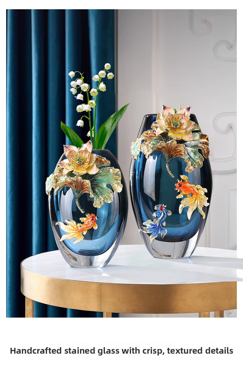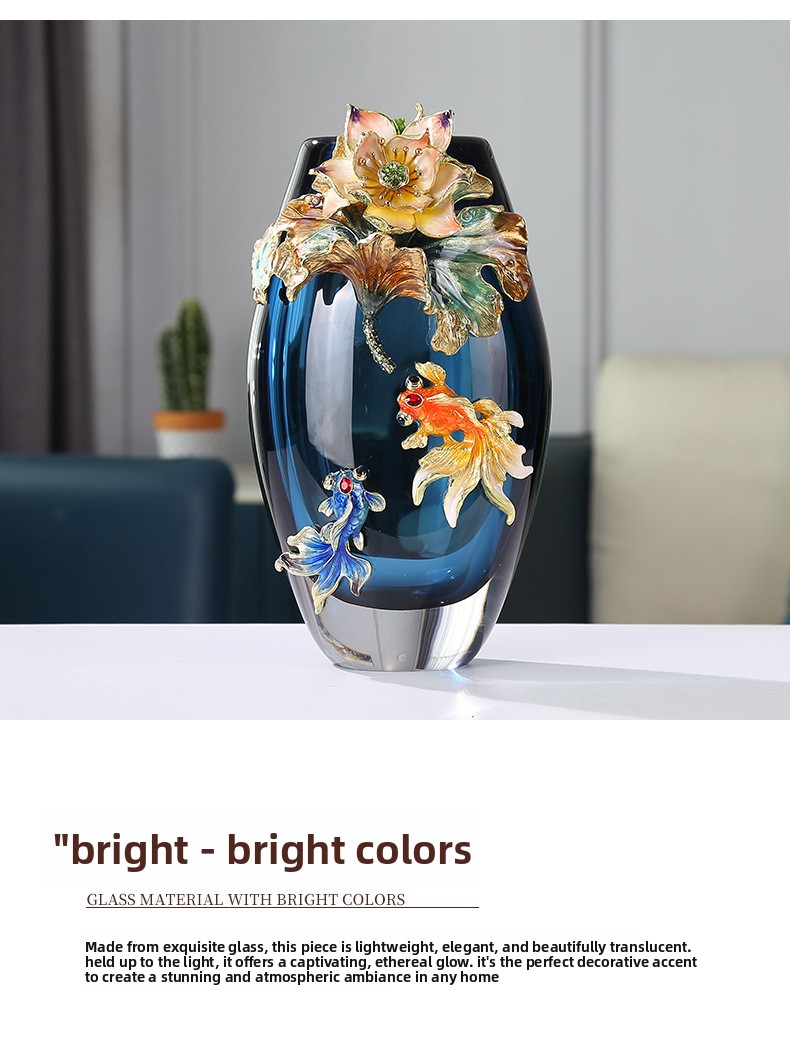 Hand-blown colored glass vase with fish & lotus leaf design. Modern artisan decor for living room, entryway & weddings. Unique statement piece.