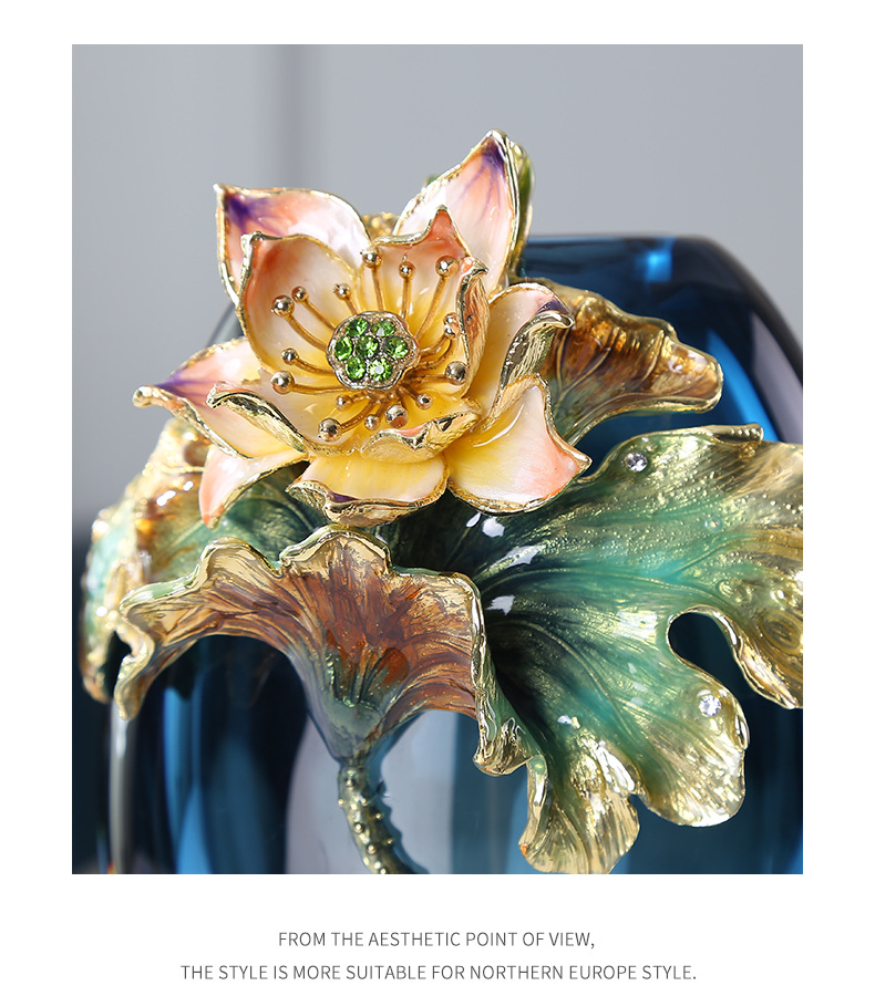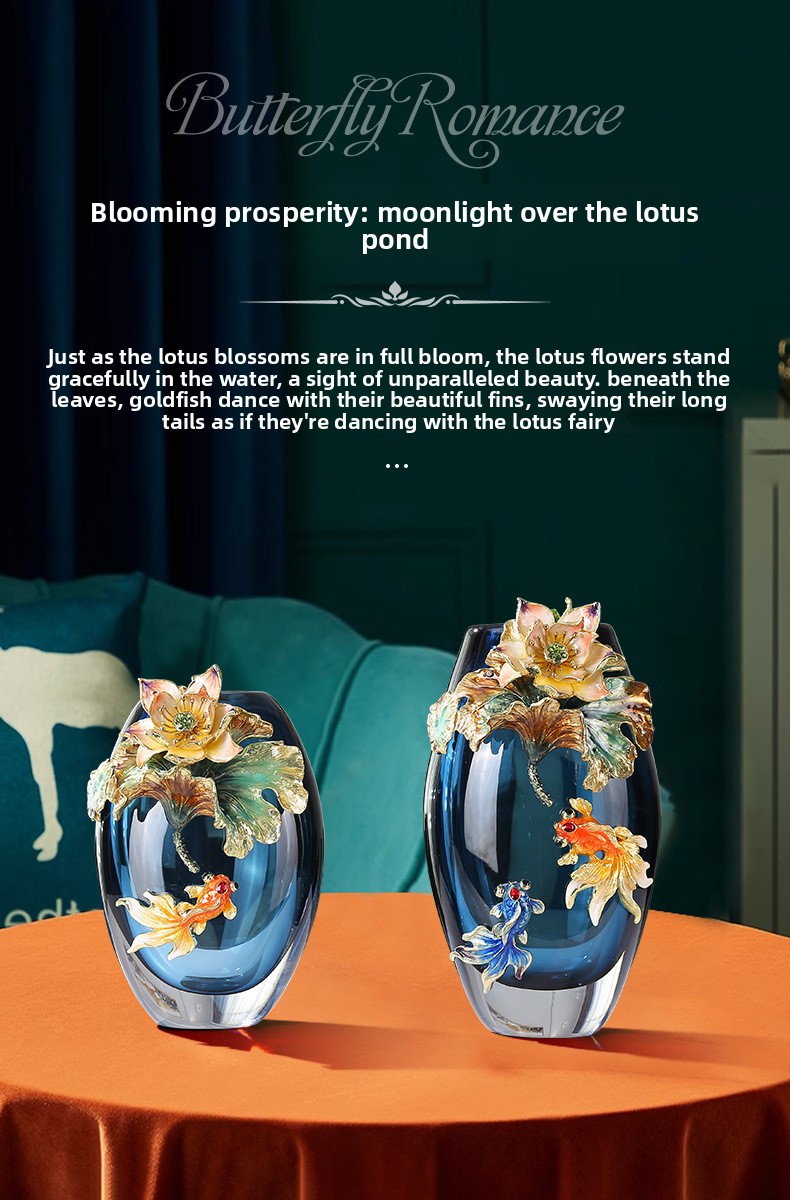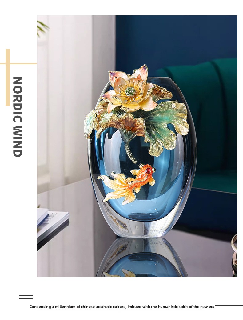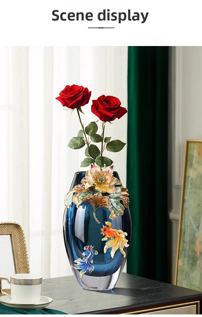 Hand-blown colored glass vase with fish & lotus leaf design. Modern artisan decor for living room, entryway & weddings. Unique statement piece.