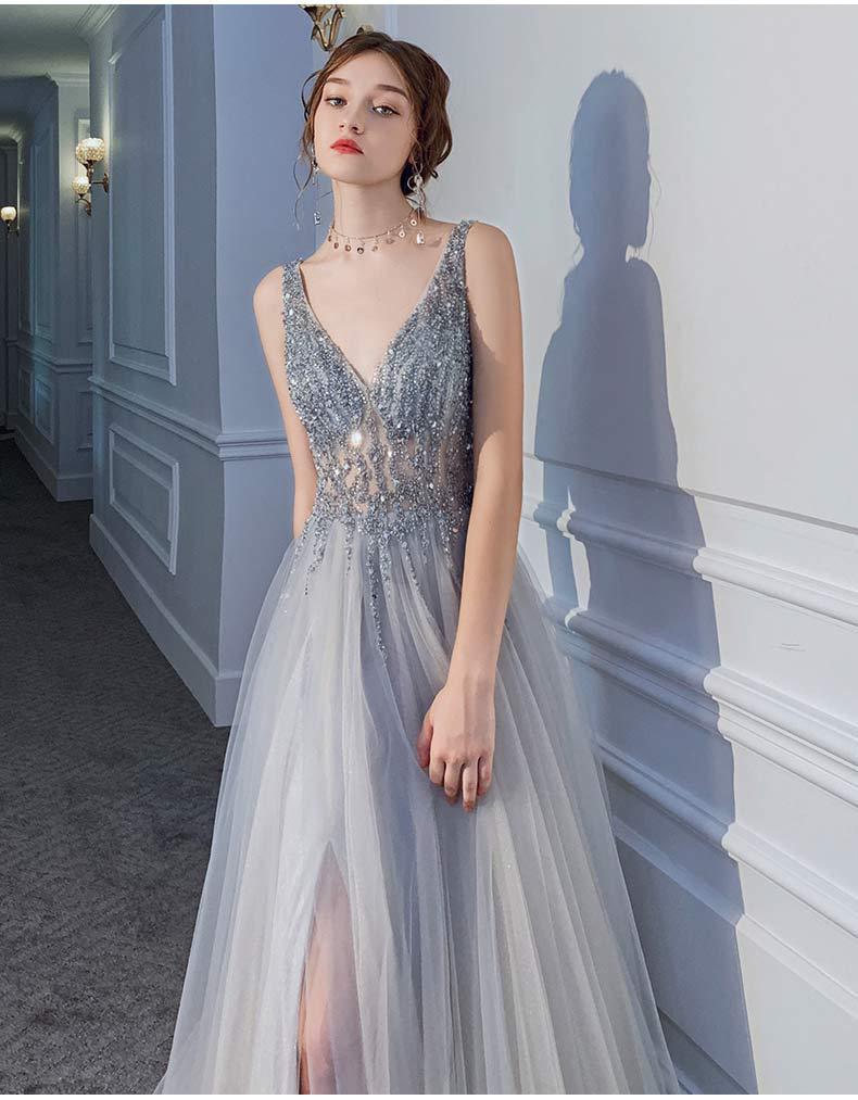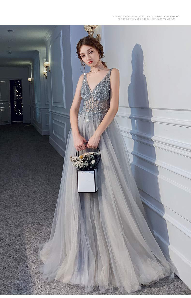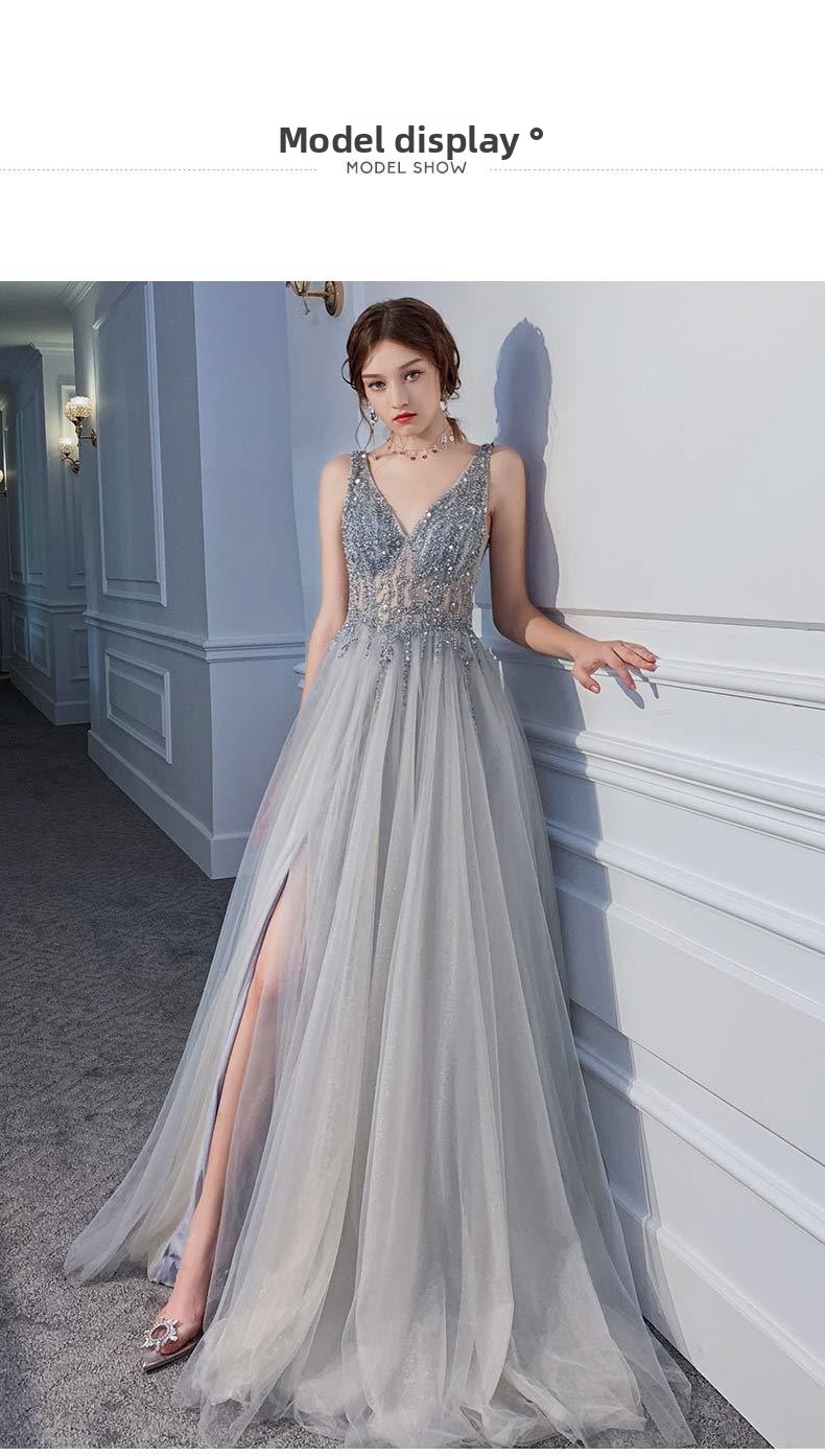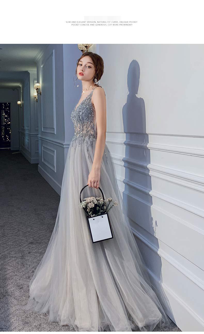 Glamorous sequin backless evening dress with deep V-neck & slimming fit. Perfect for formal events & parties. Silver gray & red. XS-5XL available.
