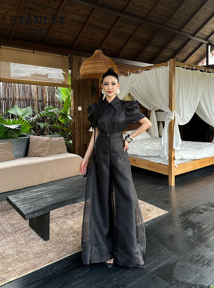 Stylish two-piece summer set with stand collar button top and high-waisted wide-leg pants. Slimming fit in polyester. Sizes S-XXL. Black or white.