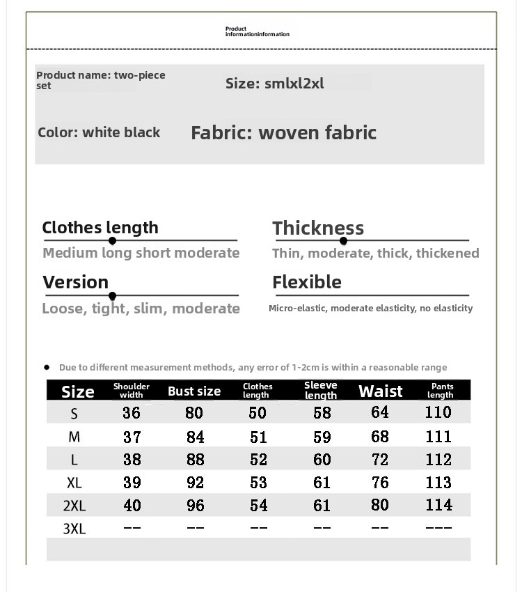 Color Options: Black set, White set, White top only, Black top only, White pants only, Black pants only